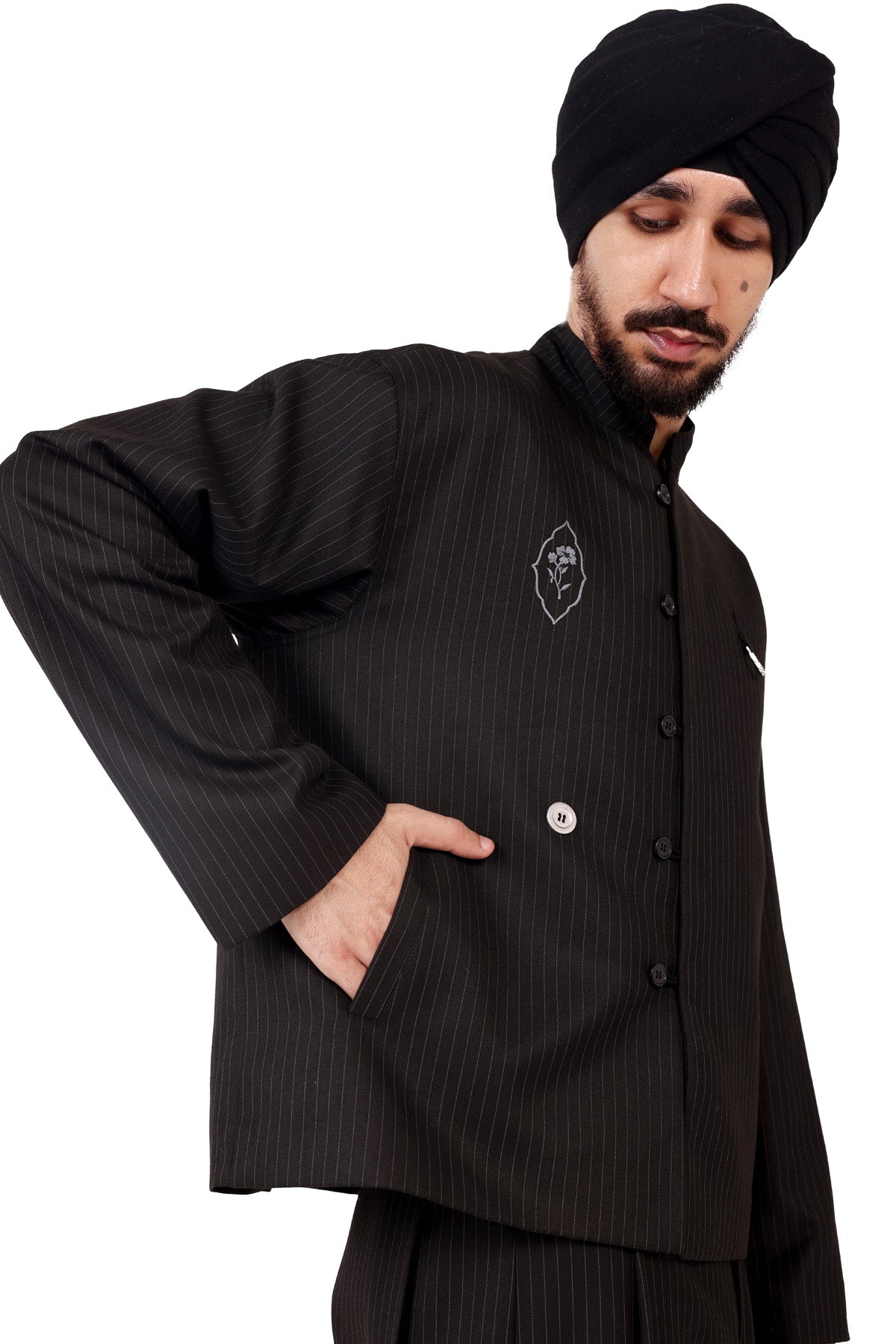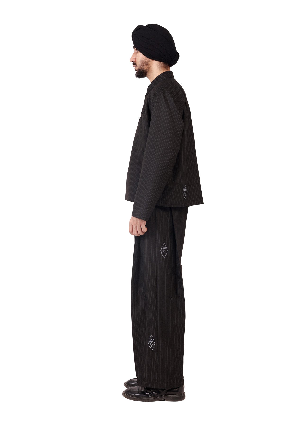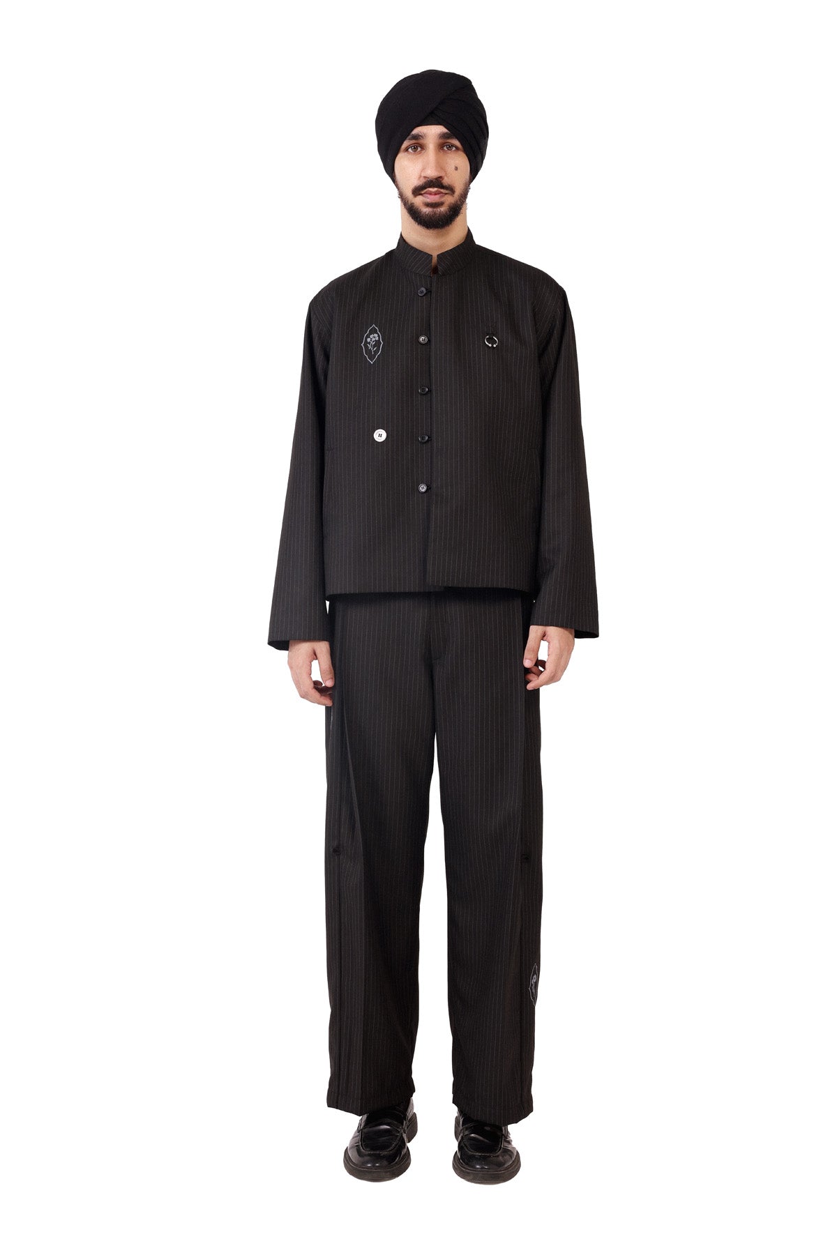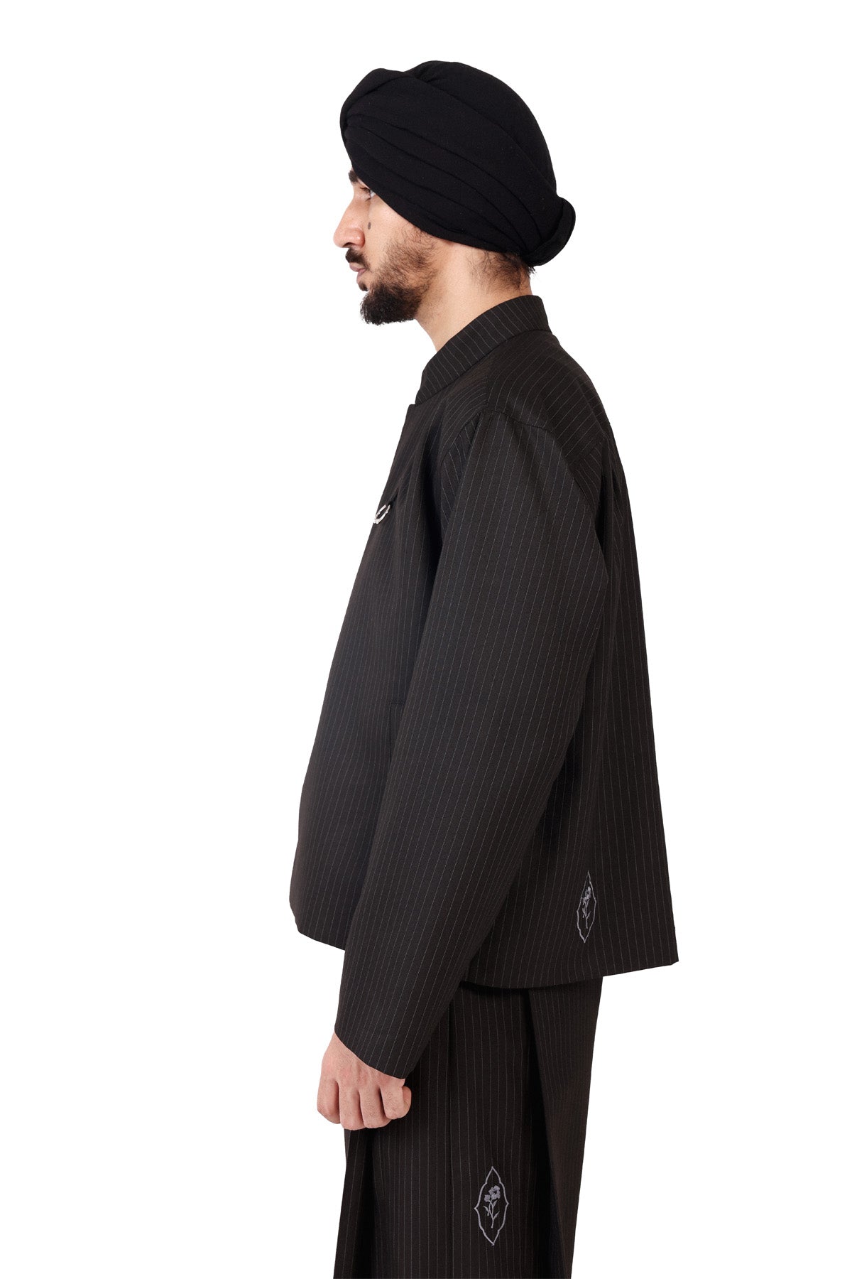 General Jacket with embroidery details and custom button loops closure, oversized fitting with a slight crop. Distinctive lahoS logo detail on left side.