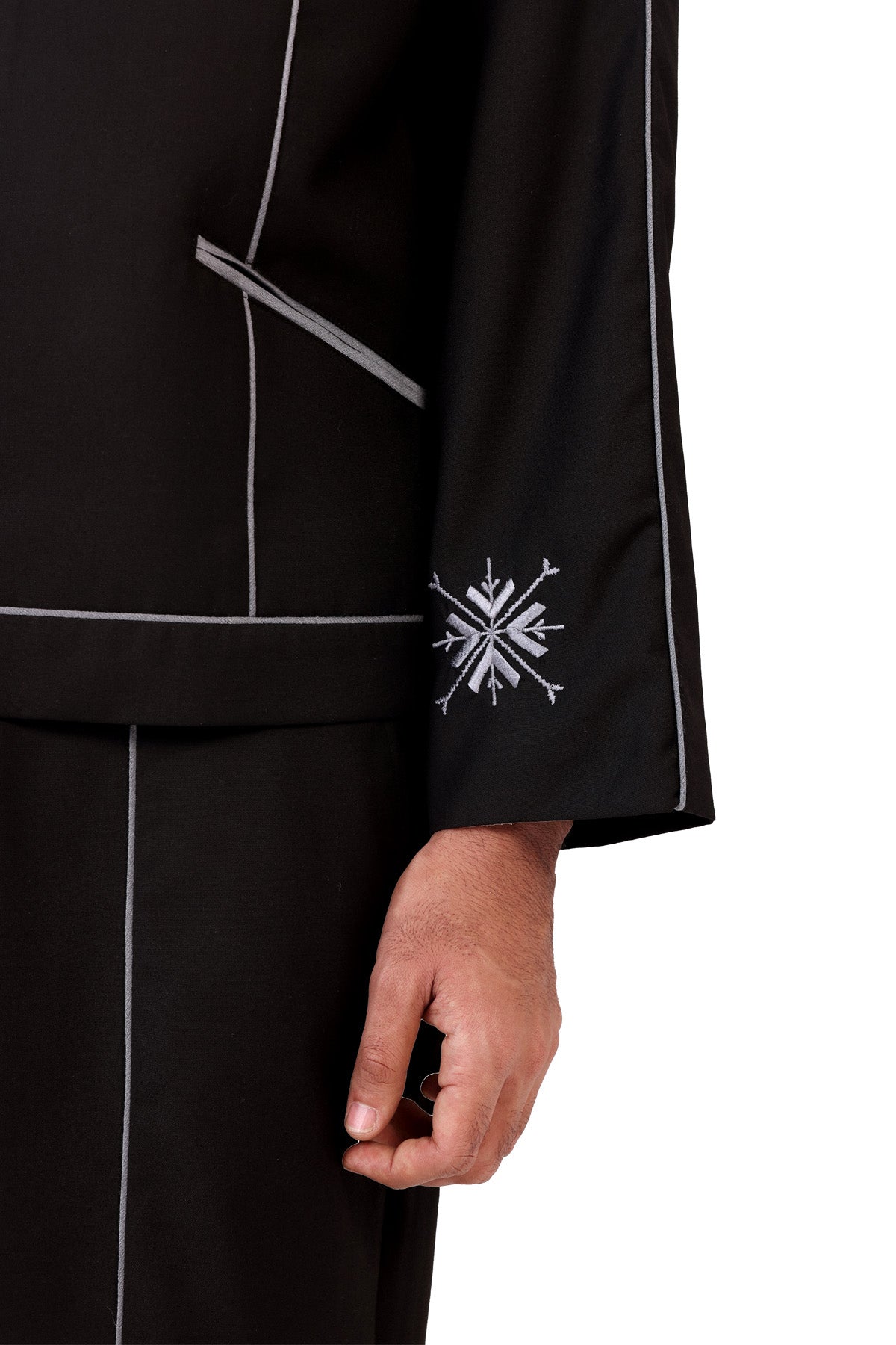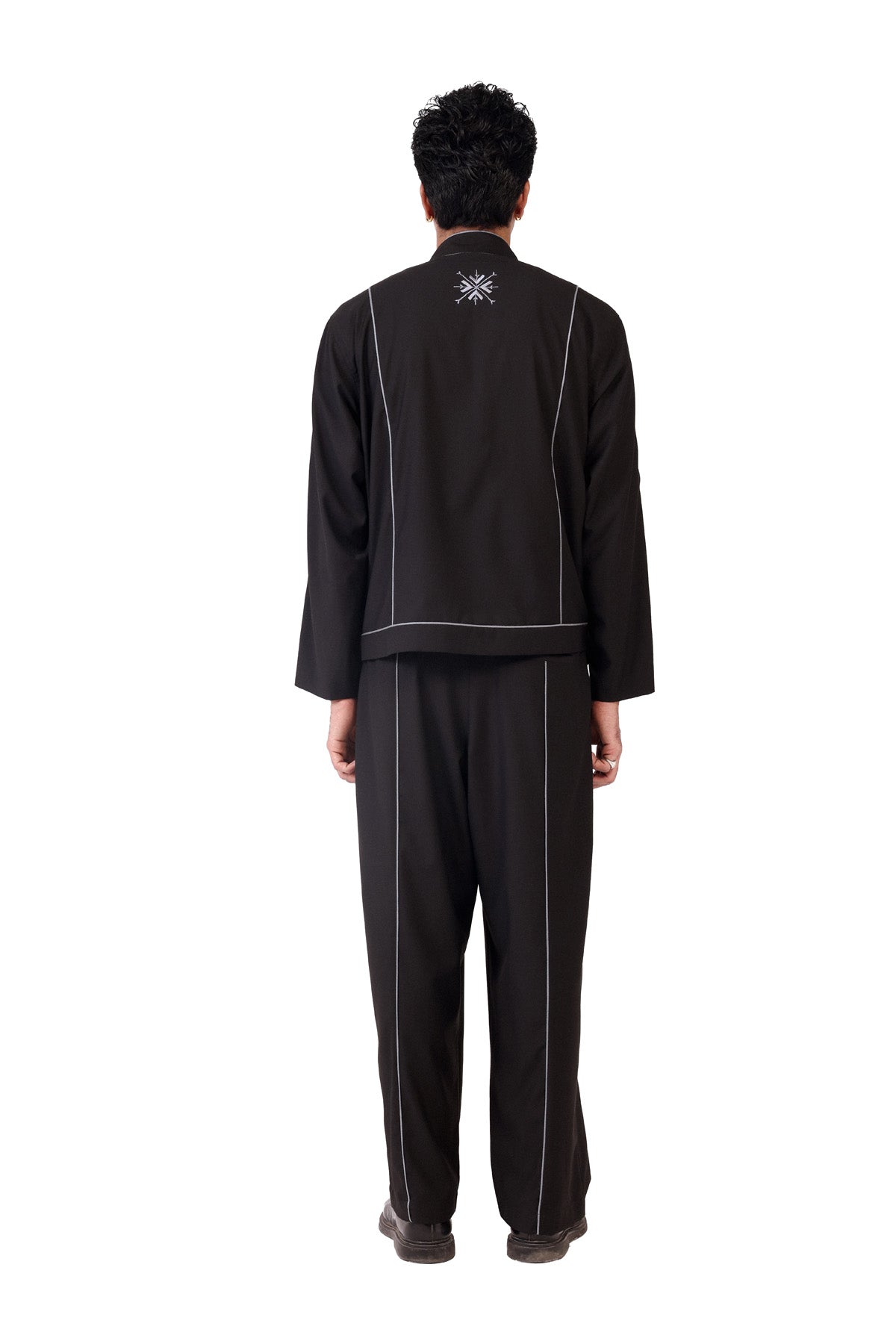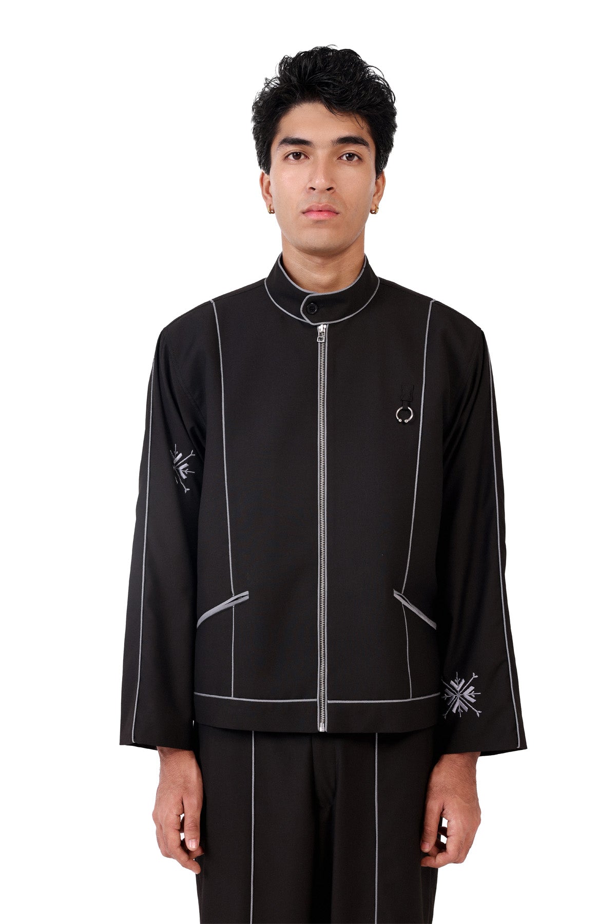 A straight fit jacket, slightly oversized for layering with piping detail on the front and back