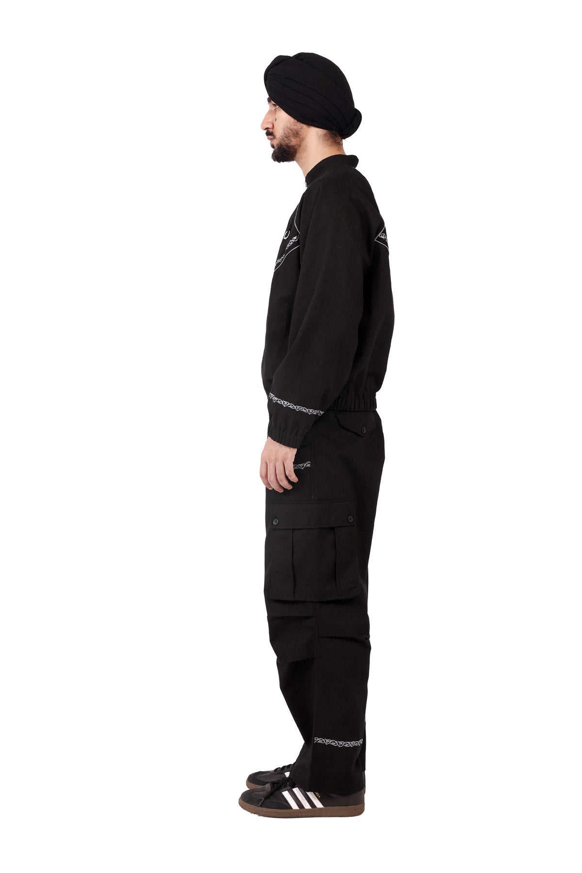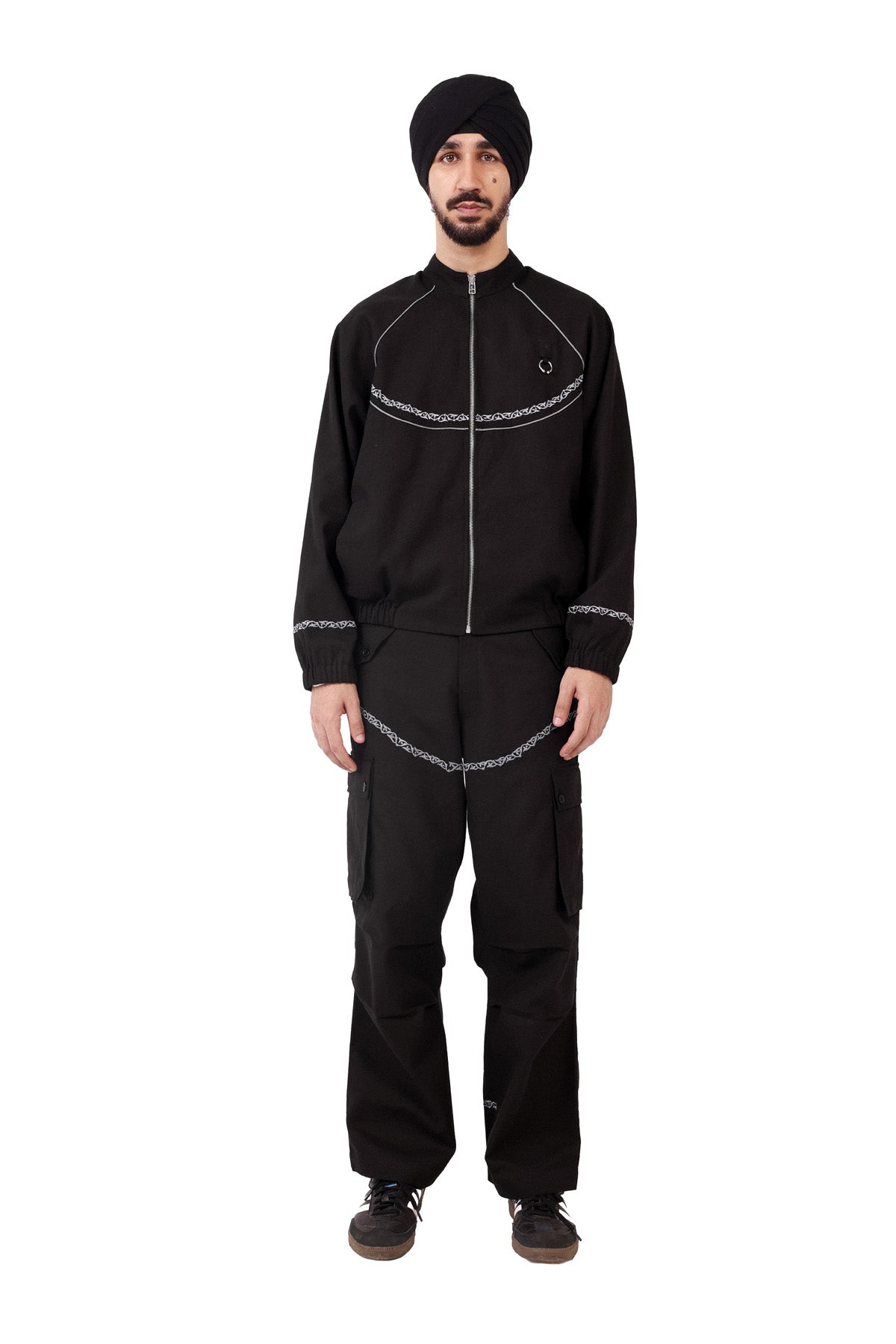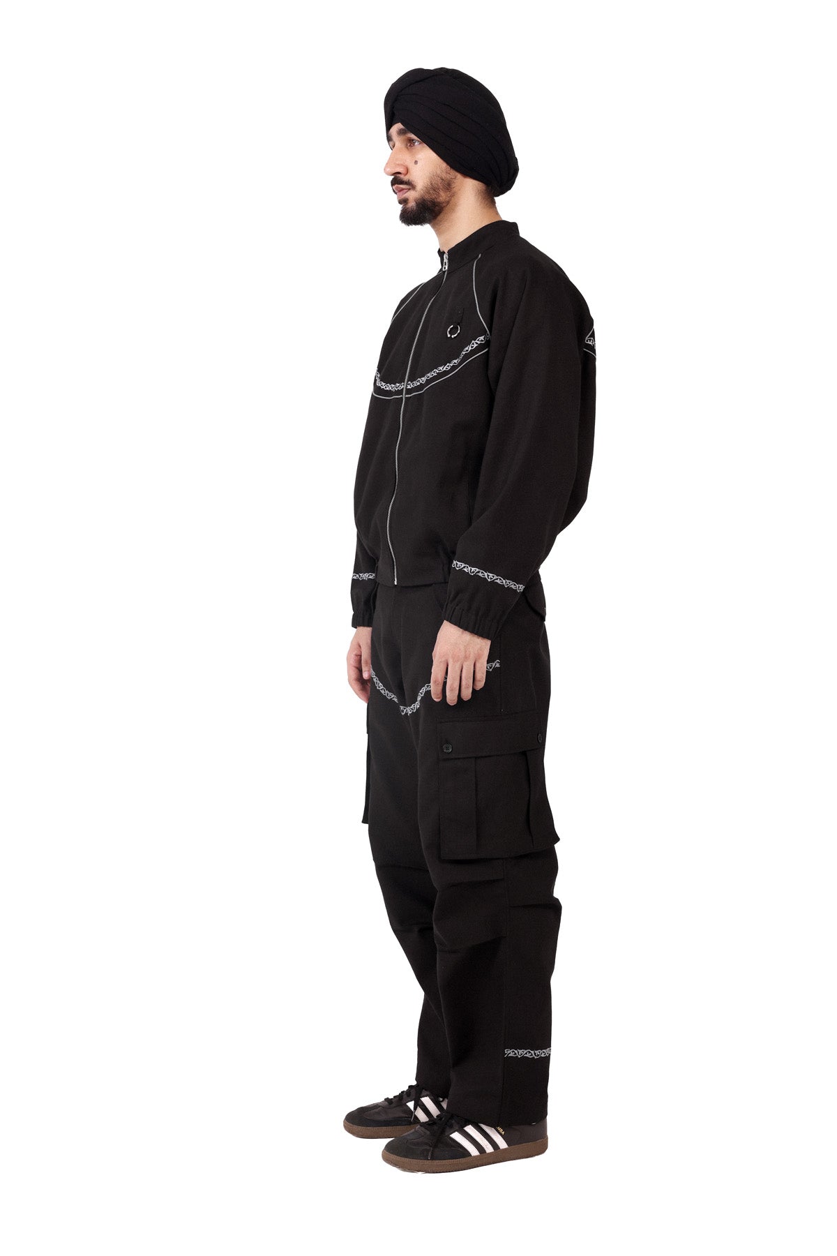 Blended Nehru and raglan jacket, lahoS takes on a track jacket. Piping details on front and back.